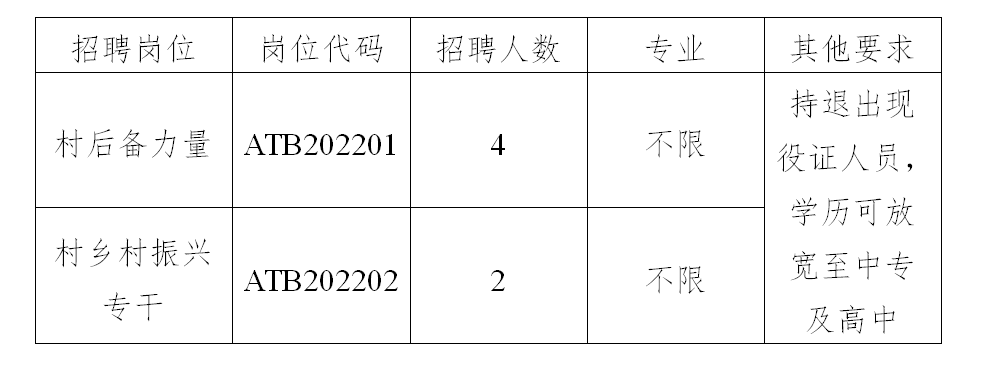 因工作需要,經(jīng)研究,現(xiàn)面向社會(huì)公開(kāi)招聘4名村級(jí)后備力量和2名鄉(xiāng)村振興專干,現(xiàn)將有關(guān)事項(xiàng)公告如下: