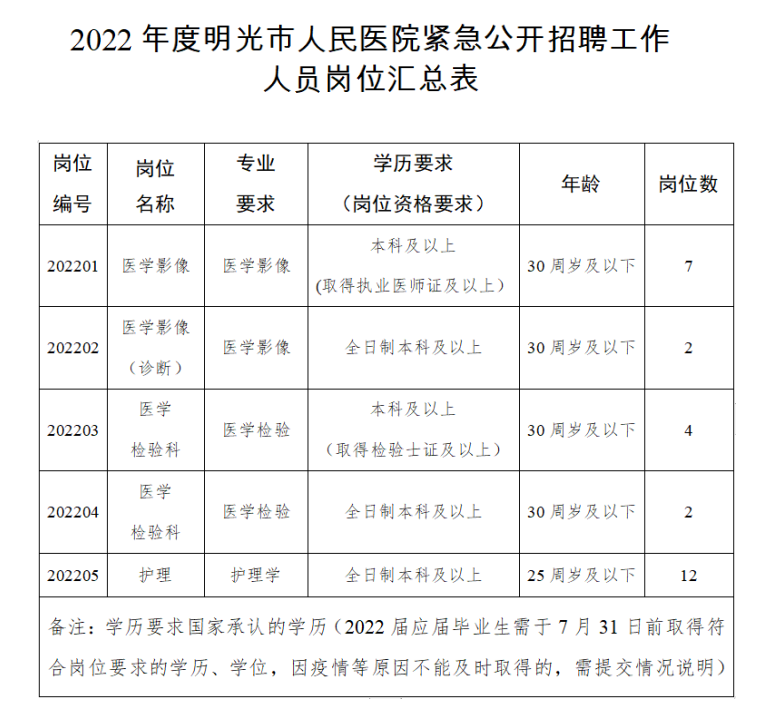 1.2022年明光市人民醫(yī)院緊急公開招聘工作人員崗位匯總表