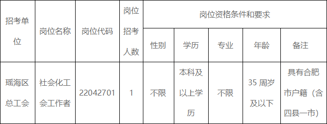 結(jié)合實際工作需要,經(jīng)研究決定,瑤海區(qū)總工會2022年面向合肥市公開招聘社會化工會工作者1名,現(xiàn)將有關(guān)事項公告如下: