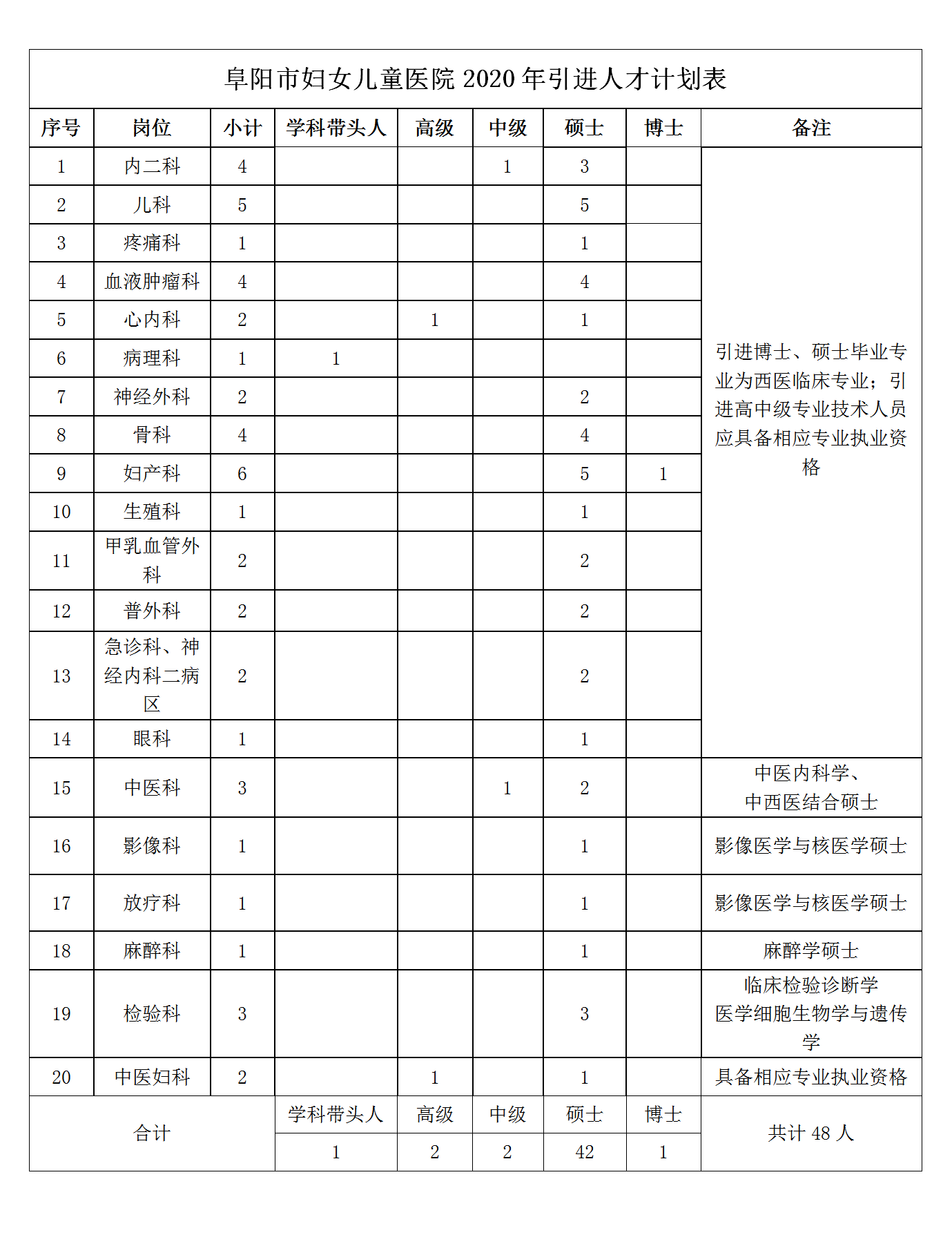 2020-06-09 22:11:32閱讀()阜陽市婦女兒童醫(yī)院為滿足我院發(fā)展和學(xué)科建設(shè)需要,根據(jù)《安徽省人民政府辦公廳關(guān)于鞏固完善縣級公立醫(yī)院綜合改革的意見》(皖政辦〔2014〕6號)及《安徽省人民政府關(guān)于印發(fā)安徽省深化醫(yī)藥衛(wèi)生體制綜合改革試點方案的通知》皖政〔2015〕16號文件精神,加強院內(nèi)衛(wèi)生專業(yè)技術(shù)骨干培養(yǎng),建設(shè)高層次衛(wèi)生人才隊伍,結(jié)合《阜陽市婦女兒童醫(yī)院引進醫(yī)療人才工作實施細則》要求,現(xiàn)將阜陽市婦女兒童醫(yī)院2020年引進醫(yī)療人才崗位計劃公告如下。