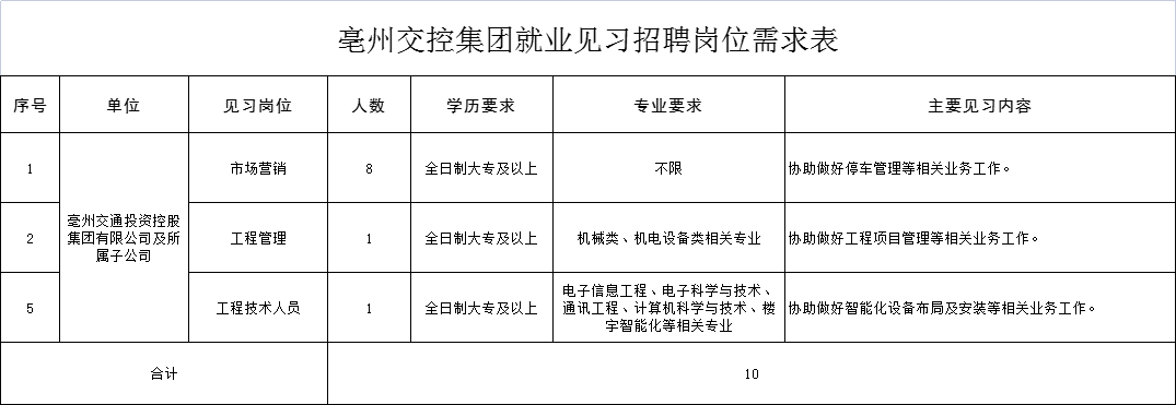 招聘崗位條件及崗位職責(zé)詳見附件《亳州交控集團(tuán)就業(yè)見習(xí)招聘崗位需求表》。