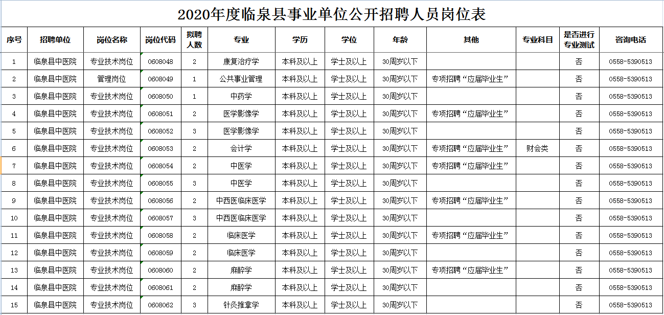 2020年度臨泉縣事業(yè)單位面向社會公開招聘人員工作已經(jīng)開始,臨泉縣中醫(yī)院計(jì)劃帶編招錄32人。