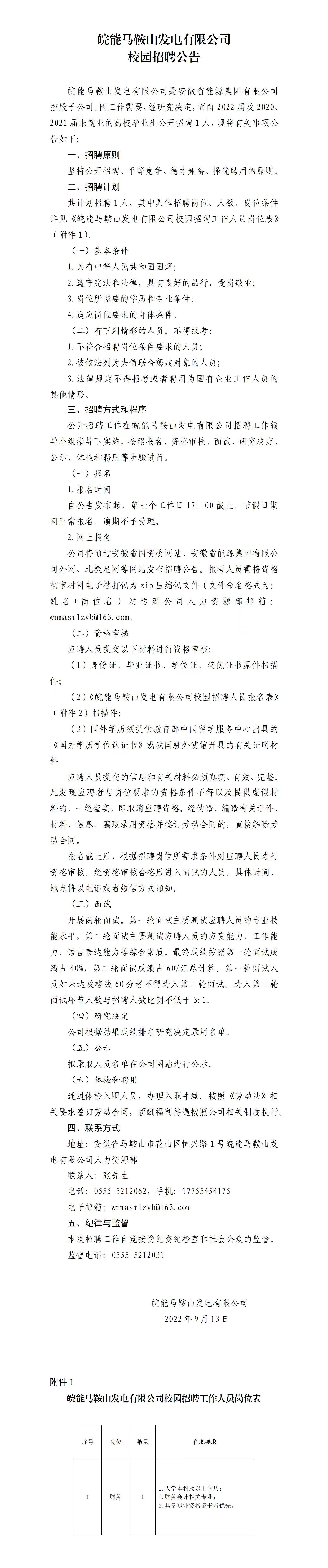 共計劃招聘1人,其中具體招聘崗位、人數(shù)、崗位條件詳見《皖能馬鞍山發(fā)電有限公司校園招聘工作人員崗位表》(附件1)。