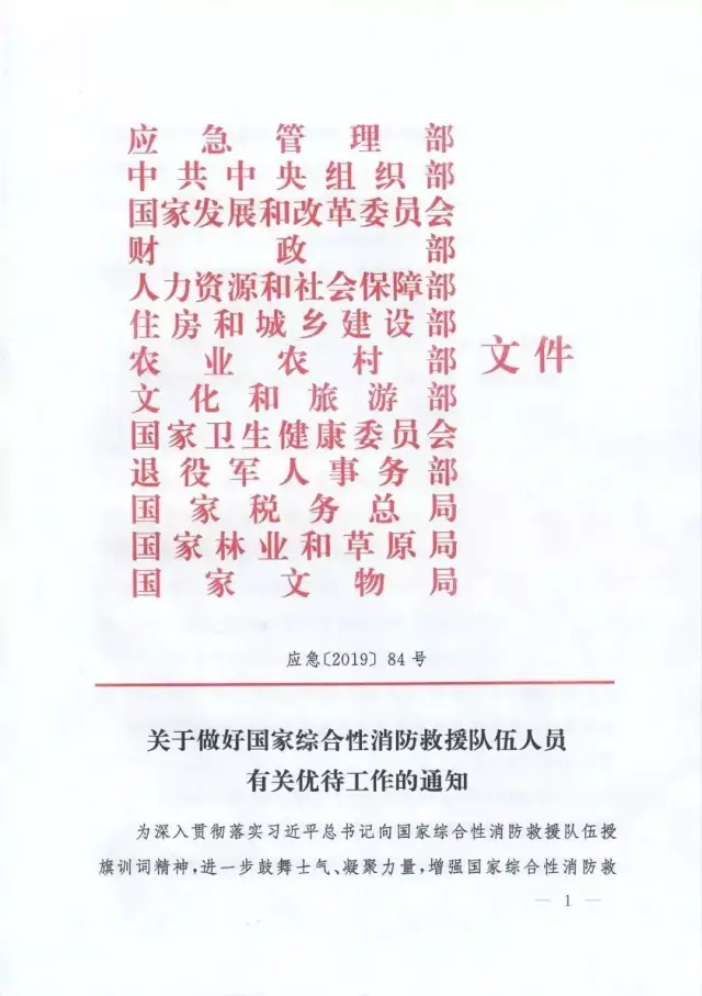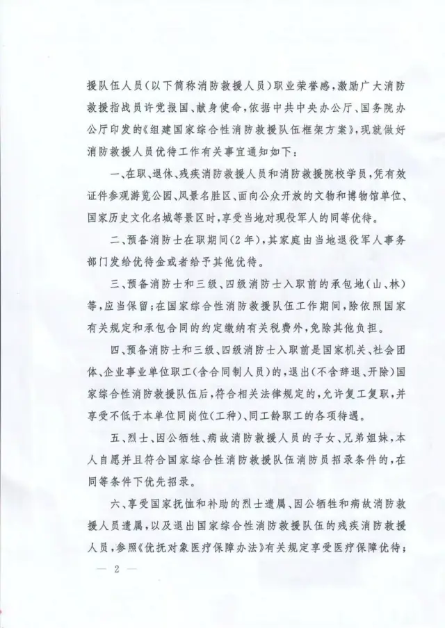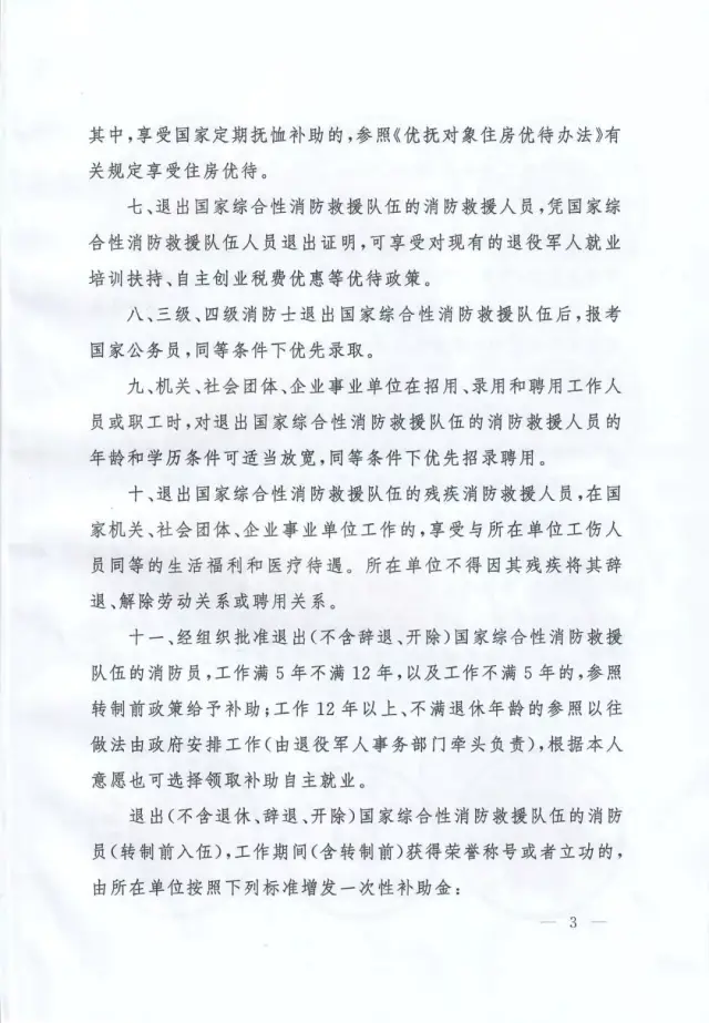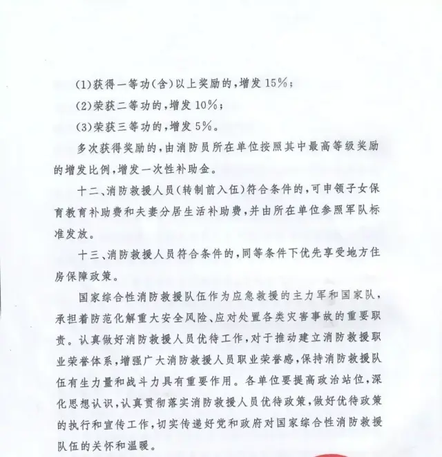 國家發(fā)展改革委員會、教育部、財(cái)政部、人力資源社會保障部、交通運(yùn)輸部、退役軍人事務(wù)部等部委與應(yīng)急管理部聯(lián)合出臺的《關(guān)于做好國家綜合性消防救援隊(duì)伍人員有關(guān)優(yōu)待工作的通知》(應(yīng)急〔2019〕84號)、《關(guān)于保障國家綜合性消防救援隊(duì)伍人員交通出行優(yōu)待權(quán)益有關(guān)事項(xiàng)的通知》(交運(yùn)規(guī)〔2019〕4號)等文件,明確國家綜合性消防救援隊(duì)伍人員在傷亡撫恤、退出安置、就業(yè)創(chuàng)業(yè)、家庭優(yōu)待、子女入學(xué)、住房醫(yī)療、交通出行、參觀游覽等方面享受專門優(yōu)待政策。