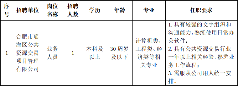 因工作需要,合肥市瑤海區(qū)公共資源交易項(xiàng)目管理有限公司計(jì)劃面向社會(huì)公開招聘業(yè)務(wù)人員1名,現(xiàn)就有關(guān)事項(xiàng)公告如下: