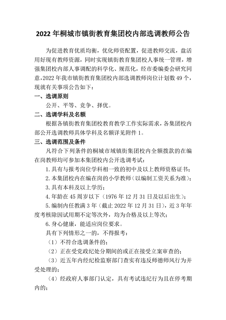 2022年安慶桐城市鎮(zhèn)街教育集團(tuán)校內(nèi)部選調(diào)教師公告