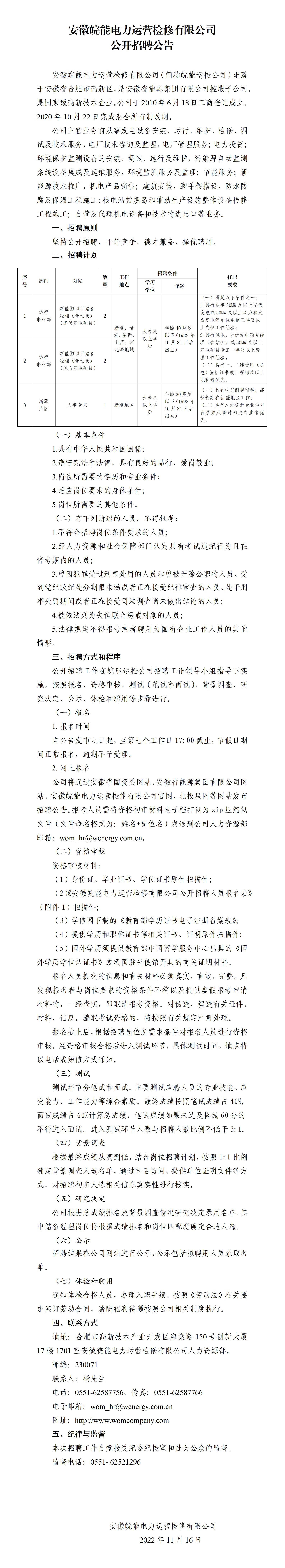 2022年安徽皖能電力運(yùn)營(yíng)檢修有限公司公開(kāi)招聘公告