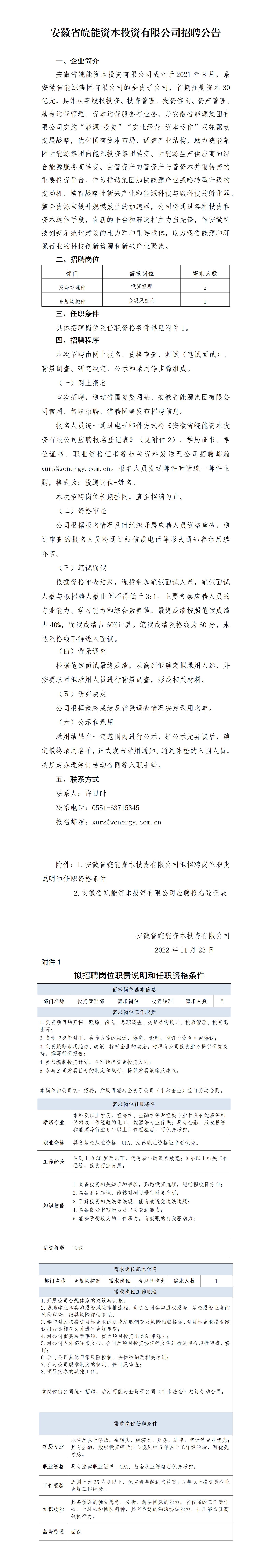 安徽省皖能資本投資有限公司成立于2021年8月,系安徽省能源集團(tuán)有限公司的全資子公司,首期注冊(cè)資本30億元,具體從事股權(quán)投資、投資管理、投資咨詢、資產(chǎn)管理、基金運(yùn)營(yíng)管理、資本運(yùn)營(yíng)服務(wù)等業(yè)務(wù),是安徽省能源集團(tuán)有限公司實(shí)施“能源+投資”“實(shí)業(yè)經(jīng)營(yíng)+資本運(yùn)作”雙輪驅(qū)動(dòng)發(fā)展戰(zhàn)略,優(yōu)化國(guó)有資本布局,調(diào)整產(chǎn)業(yè)結(jié)構(gòu),助力皖能集團(tuán)由能源集團(tuán)向能源投資集團(tuán)轉(zhuǎn)變、由能源生產(chǎn)供應(yīng)商向綜合能源服務(wù)商轉(zhuǎn)變、由管資產(chǎn)向管資產(chǎn)與管資本并重轉(zhuǎn)變的重要投資平臺(tái)。作為推動(dòng)集團(tuán)加快能源產(chǎn)業(yè)戰(zhàn)略轉(zhuǎn)型升級(jí)的發(fā)動(dòng)機(jī)、培育戰(zhàn)略性新興產(chǎn)業(yè)和能源科技與碳科技的孵化器、整合資源與提升規(guī)模效益的加速器,公司將通過(guò)各種投資和資本運(yùn)作手段,在新的平臺(tái)和賽道打主力當(dāng)先鋒,作安徽科技創(chuàng)新示范地建設(shè)的生力軍和重要載體,助力我省能源和環(huán)保行業(yè)的科技創(chuàng)新策源和新興產(chǎn)業(yè)聚集。