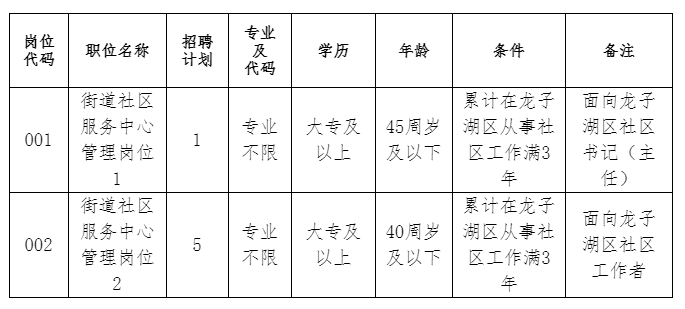 招聘對(duì)象為龍子湖區(qū)在職城區(qū)社區(qū)工作者,主要包括社區(qū)“兩委”專職成員及由省、市、區(qū)統(tǒng)一招錄的社區(qū)專職工作人員(含大學(xué)生特崗、網(wǎng)格員、各類協(xié)管員),在必須符合《蚌埠市面向社區(qū)工作者公開招聘事業(yè)單位工作人員實(shí)施方案》規(guī)定條件基礎(chǔ)上,還需具有以下條件: