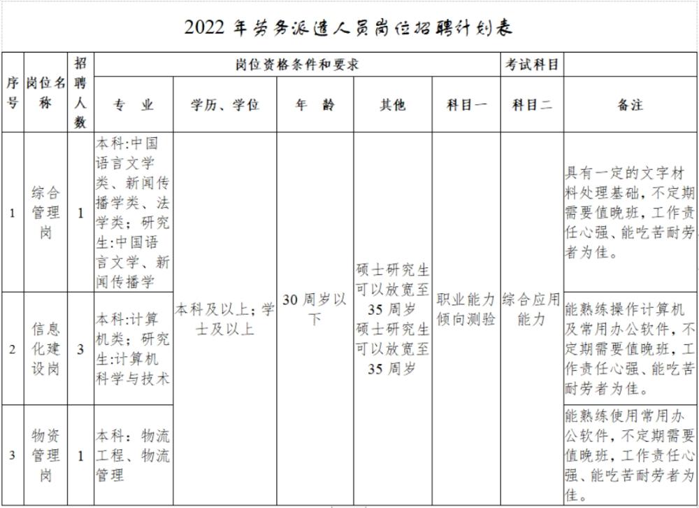 本次公開招聘綜合管理崗1名、信息化建設(shè)崗3名、物資管理崗1名。