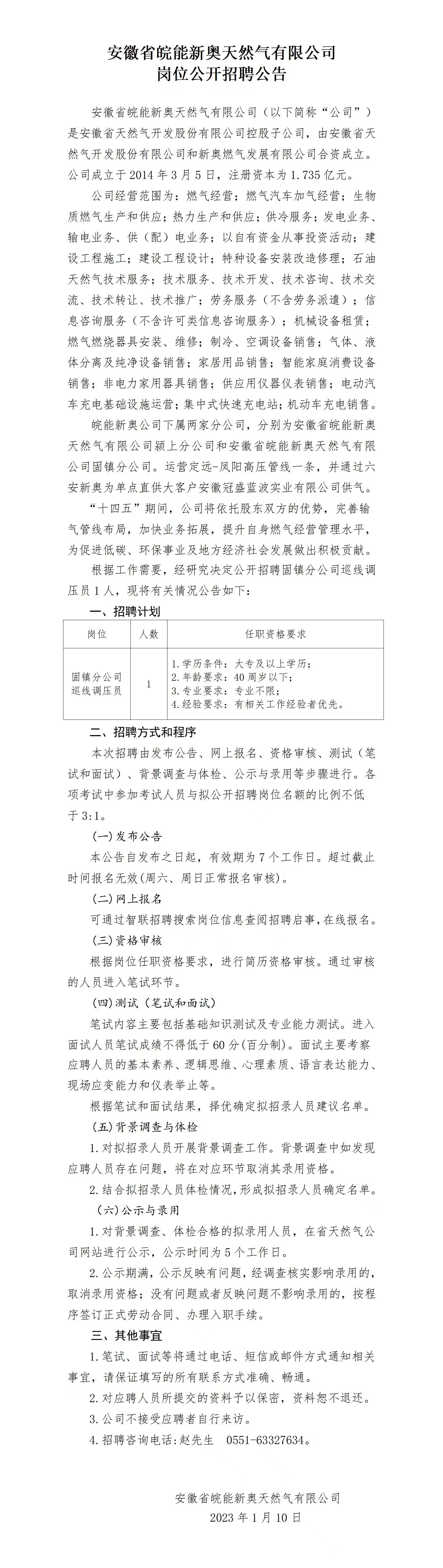 2023年安徽省皖能新奧天然氣有限公司崗位公開招聘公告