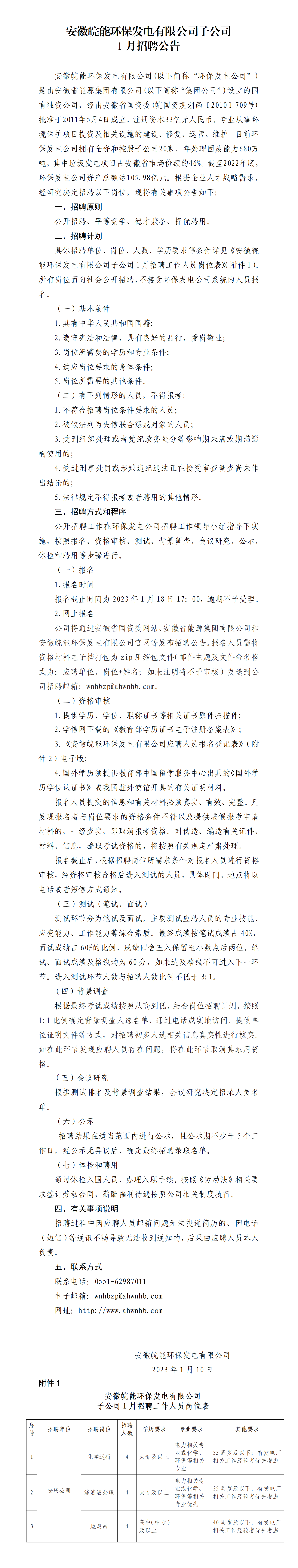 具體招聘單位、崗位、人數(shù)、學(xué)歷要求等條件詳見《安徽皖能環(huán)保發(fā)電有限公司子公司1月招聘工作人員崗位表》附件1)。所有崗位面向社會(huì)公開招聘,不接受環(huán)保發(fā)電公司系統(tǒng)內(nèi)人員報(bào)名。