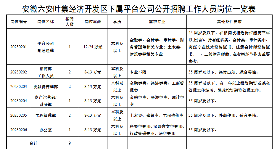 根據(jù)工作需要,安徽六安葉集經(jīng)濟(jì)開發(fā)區(qū)下屬平臺(tái)公司(國(guó)有企業(yè))現(xiàn)擬面向社會(huì)公開招聘9名工作人員,現(xiàn)就有關(guān)事項(xiàng)公告如下: