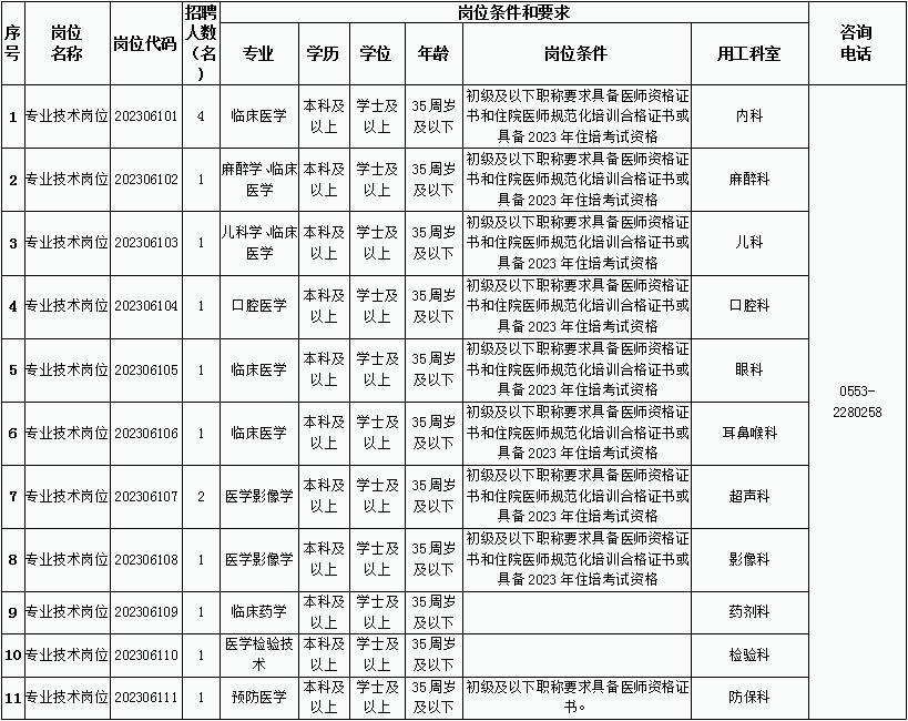蕪湖市六院2023年公開招聘編內(nèi)工作人員崗位表(預(yù)公告)