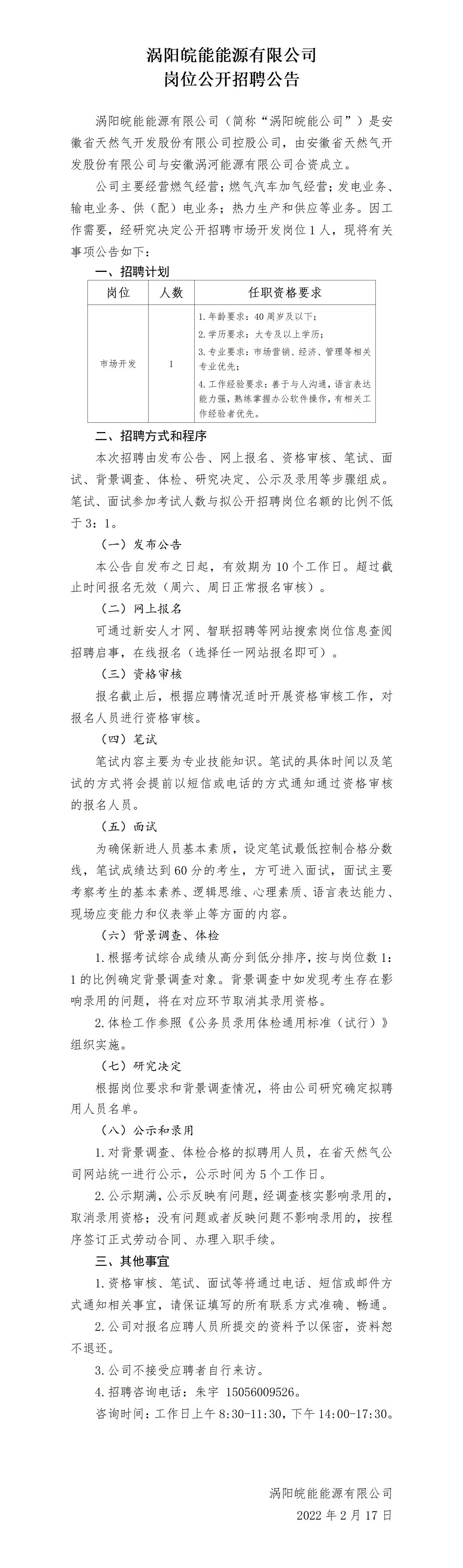 2023年亳州渦陽皖能能源有限公司崗位公開招聘公告