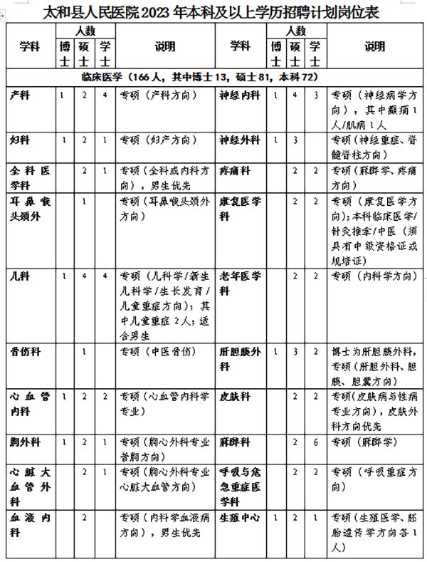 2023-03-02 10:27:31閱讀()太和縣人民醫(yī)院太和縣人民醫(yī)院始建于1949年,2018年晉升三級甲等綜合醫(yī)院,實(shí)現(xiàn)全省縣級醫(yī)院創(chuàng)建三級甲等綜合醫(yī)院“零突破”,先后獲評國際愛嬰醫(yī)院、全國綜合醫(yī)院中醫(yī)藥工作示范單位、全國敬老文明號、全國醫(yī)院后勤管理創(chuàng)新示范單位、全國改善醫(yī)療服務(wù)示范醫(yī)院、全國現(xiàn)代醫(yī)院管理制度示范醫(yī)院、全省新冠肺炎疫情防控先進(jìn)集體等榮譽(yù)稱號,獲批國家住院醫(yī)師規(guī)范化培訓(xùn)基地、安徽省助理全科醫(yī)生規(guī)范化培訓(xùn)基地、阜陽市急診醫(yī)學(xué)和重癥醫(yī)學(xué)專科護(hù)士臨床培訓(xùn)基地、標(biāo)準(zhǔn)版胸痛中心、生殖醫(yī)學(xué)中心、高級卒中中心和互聯(lián)網(wǎng)醫(yī)院認(rèn)證,2021年掛牌設(shè)立皖南醫(yī)學(xué)院附屬太和醫(yī)院。全院編制床位1600張;擁有磁共振2臺、CT6臺、DSA2臺以及直線加速器、PET-CT、體外循環(huán)機(jī)等國內(nèi)外先進(jìn)醫(yī)療設(shè)備。開設(shè)43個(gè)臨床學(xué)科、15個(gè)醫(yī)技科室;省級重點(diǎn)特色???個(gè)、市級重點(diǎn)專科10個(gè),35萬平方米設(shè)置2200張床位的新院區(qū)將于2023年底前正式啟用。根據(jù)新區(qū)使用和學(xué)科建設(shè)需要,2023年計(jì)劃招聘本科及以上學(xué)歷畢業(yè)生261人,現(xiàn)將有關(guān)事項(xiàng)公告如下: