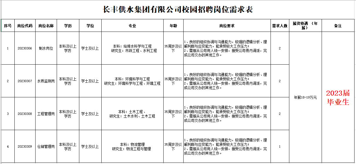 附件1:長(zhǎng)豐供水集團(tuán)有限公司校園招聘崗位需求表