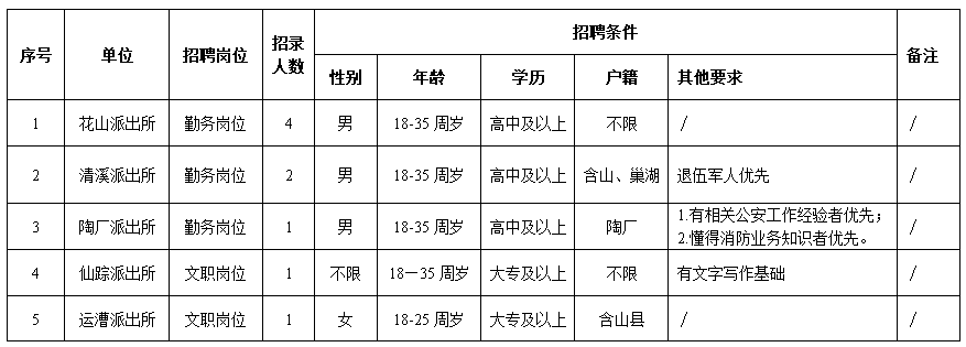 詳見(jiàn)附件1《含山縣公安局招聘警務(wù)輔助人員職位表》