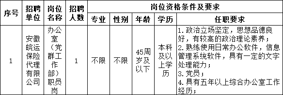 安徽皖運保險代理有限公司,成立于2012年,位于安徽省合肥市,是一家以從事保險業(yè)為主的企業(yè)。為適應(yīng)發(fā)展需要,更廣泛地選拔優(yōu)秀人才,經(jīng)研究決定,委托遠(yuǎn)創(chuàng)人力資源管理集團有限公司公開招聘1名工作人員。現(xiàn)將有關(guān)事宜公告如下: