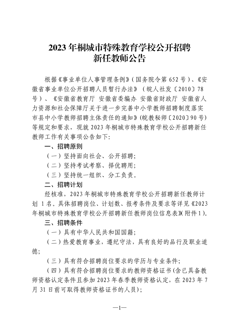 2023-06-13 17:44:37閱讀()桐城市人民政府根據(jù)《事業(yè)單位人事管理條例》(國務(wù)院令第652號)、《安徽省事業(yè)單位公開招聘人員暫行辦法》(皖人社發(fā)〔2010〕 78號) 、《安徽省教育廳安徽省委編辦安徽省財政廳安徽省人力資源和社會保障廳關(guān)于進一步完善中小學(xué)教師招聘制度落實市縣中小學(xué)教師招聘主體責(zé)任的通知》(皖教秘師〔2020390號)等規(guī)定和要求,現(xiàn)就2023年桐城市特殊教育學(xué)校公開招聘新任教師工作有關(guān)事項公告如下: