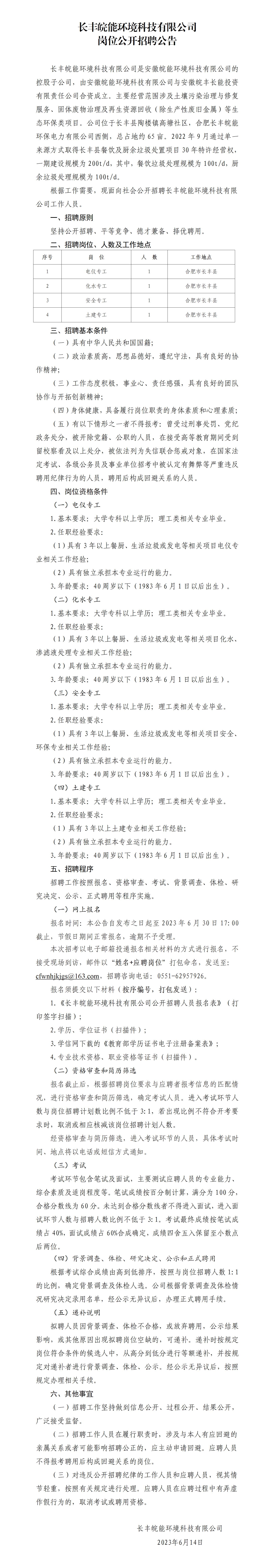 2023年合肥長豐皖能環(huán)境科技有限公司崗位公開招聘公告