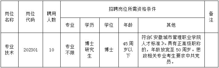 在滿足上述基本條件的前提下,招聘對象還須滿足省委編辦《關(guān)于安徽城市管理職業(yè)學(xué)院編制周轉(zhuǎn)池制度試點(diǎn)工作實(shí)施方案的批復(fù)》中的《安徽城市管理職業(yè)學(xué)院人才標(biāo)準(zhǔn)》(附件2)方能報考。