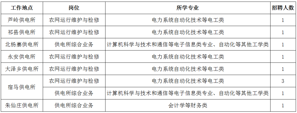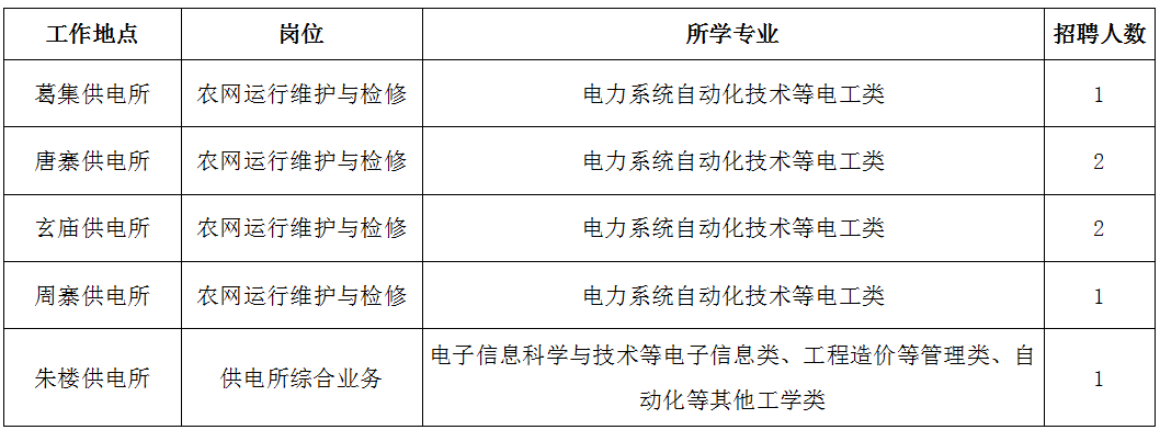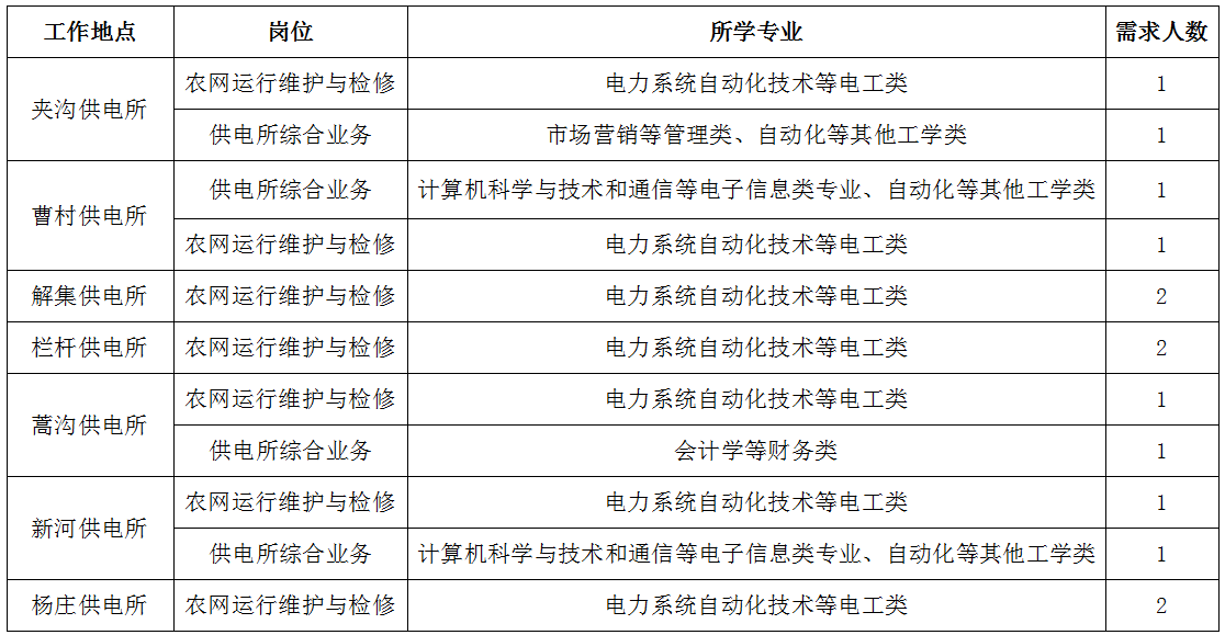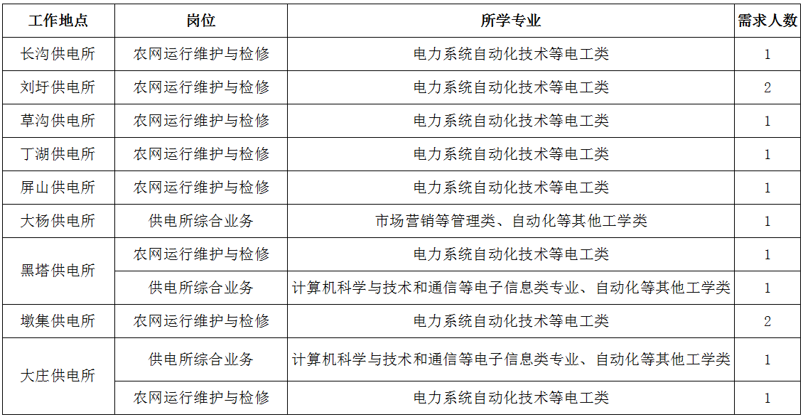 公司計劃招聘79人,派駐至鄉(xiāng)鎮(zhèn)供電所從事農(nóng)電崗位工作,其中農(nóng)網(wǎng)運行維護(hù)與檢修崗位需登桿作業(yè),限招男生。