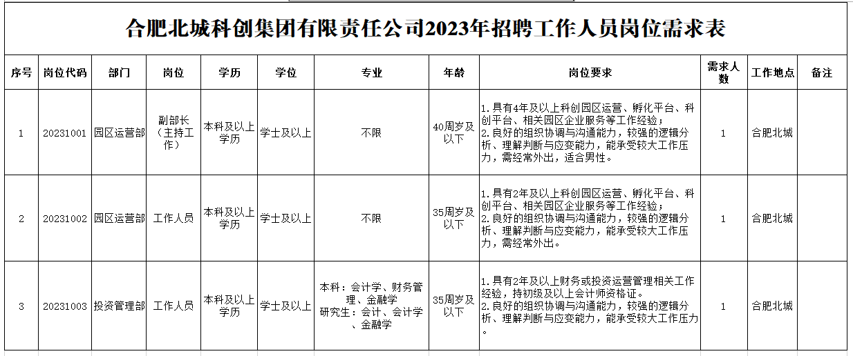 4.合肥北城科創(chuàng)集團有限責任公司有權根據(jù)崗位需求變化及簡歷投遞情況等因素,調整、取消或終止個別崗位,本次招聘最終解釋權歸合肥北城科創(chuàng)集團有限責任公司所有。