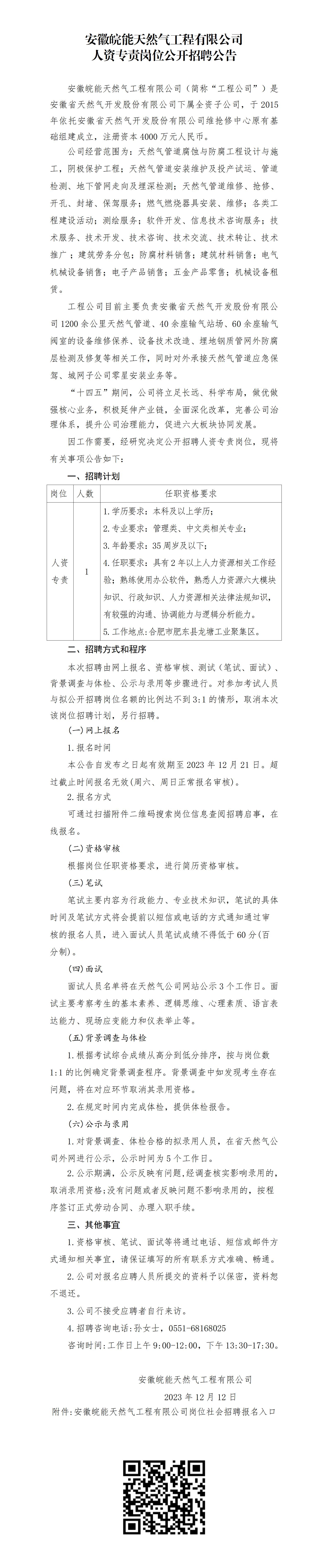 2023年安徽皖能天然氣工程有限公司人資專責(zé)崗位公開招聘公告