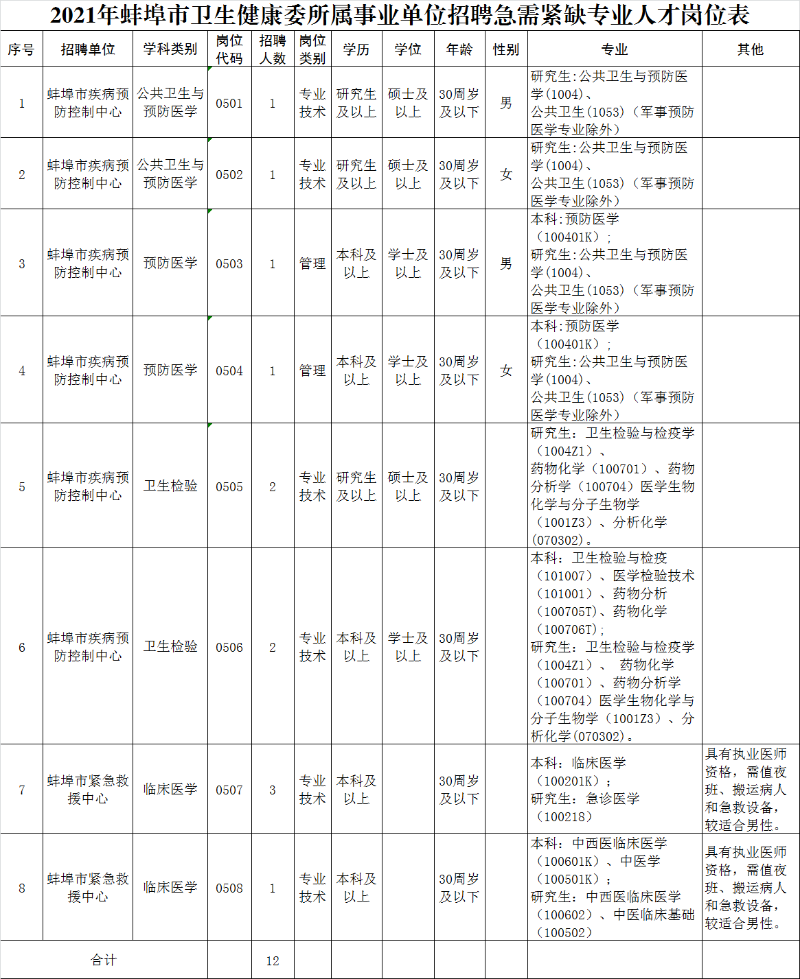 2021年蚌埠市衛(wèi)生健康委所屬事業(yè)單位招聘急需緊缺專(zhuān)業(yè)人才崗位表