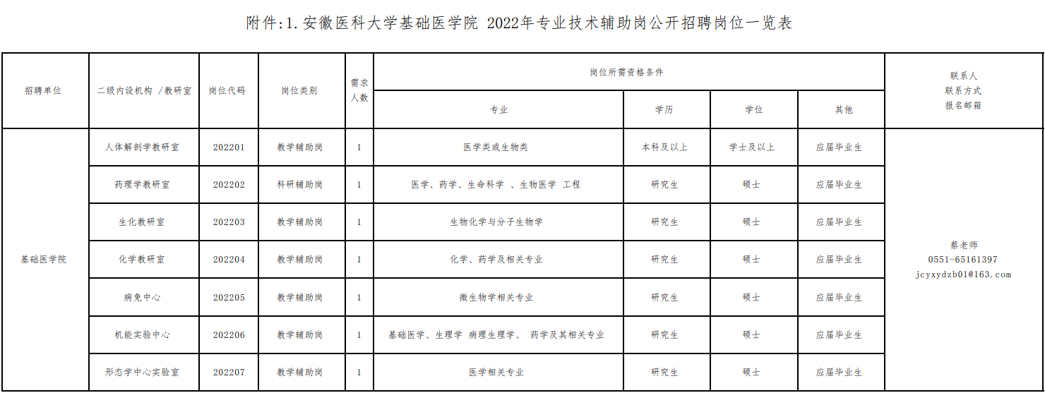 2022年安徽醫(yī)科大學基礎醫(yī)學院專業(yè)技術輔助崗公開招聘崗位一覽表