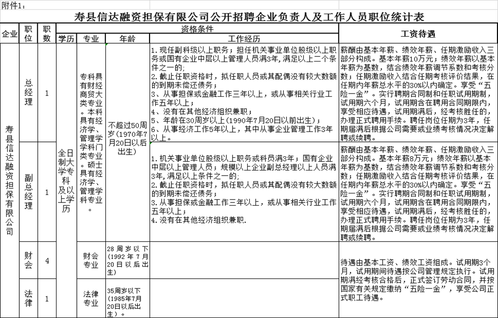 2020年淮南壽縣信達融資擔保有限公司公開招聘企業(yè)負責人及工作人員職位統計表