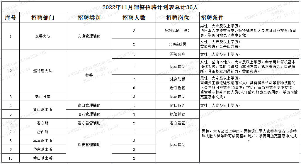 2022-11-13 19:45:07閱讀()岱山縣人民政府因工作需要,岱山縣公安局面向社會(huì)公開招聘警務(wù)輔助人員,有意者可以按以下規(guī)定條件和程序報(bào)名。